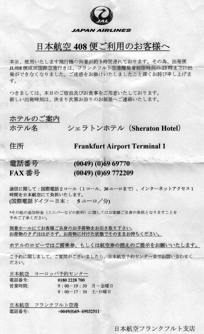 JALのカウンターの前には、飛行機の機材トラブルで日本の出発が遅れ本日は飛べないので、ホテルと食事を用意しているという。小生は暇なので遅れても問題ないが、添乗員さんなどは次の仕事があるので、非常に困っておられた。本日はどこに泊まるか?すぐに情報が来て、空港に隣接したシェラートンホテルで歩いて行けるという。