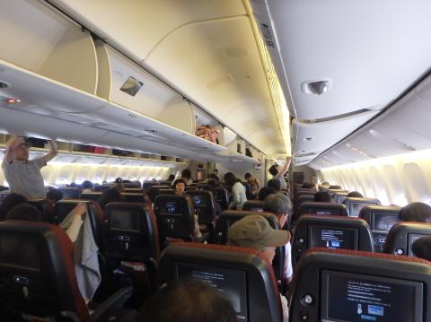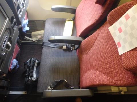 飛行機に乗るとほぼ満席ですが、ラッキーなことに隣があいています。スチアーデスさんに聞くと、席が一番後ろで狭いので販売していない席だという。、自由に使って良いというので、楽に帰ることが出来ます。