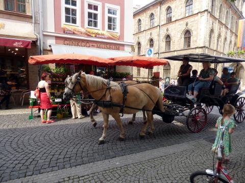 市庁舎に面した四角い広場には、果物や野菜、切り花や鉢苗、ホットドッグなどの出店で賑わっていました。周囲は市庁舎のほか、ホテルやレストランが多く、少し歩くだけで国民劇場、ゲーテやリストが住んでいた家、アンペルマンショップなどに行けます。周囲の建物も、足元の石畳も、店の商品も、全てが絵になるヨーロッパらしい風景でした。