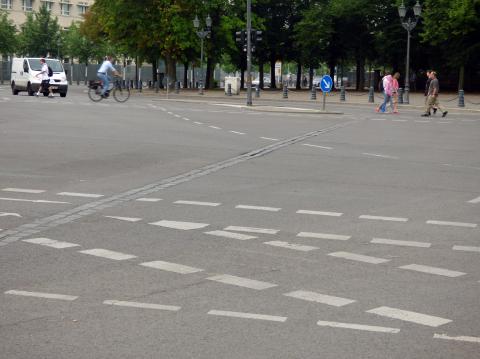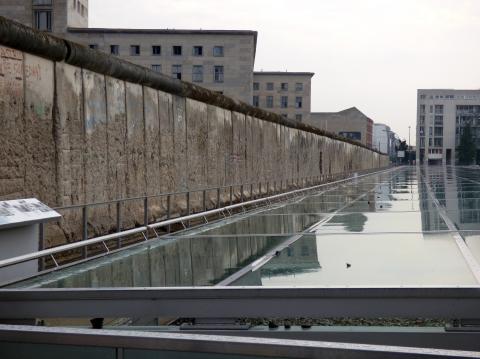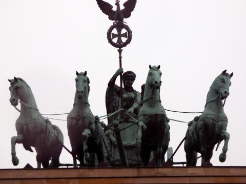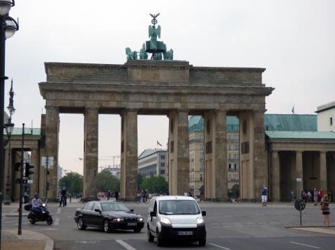 1790年(約200年前)にプロイセン王国の凱旋門として建てられたこの門を境に、その両側に東西ドイツを分けるベルリンの壁が設けられていた。ドイツの敗戦後数十年間誰もこの門をくぐることは出来なかったが、ソ連崩壊と共に1989年開放されて、今では観光のメッカとして門前の広場は賑わっている。門の上には勝利の女神と四頭だての馬車カドリカが飾られている。道路にはベルリンの壁の跡がありました。