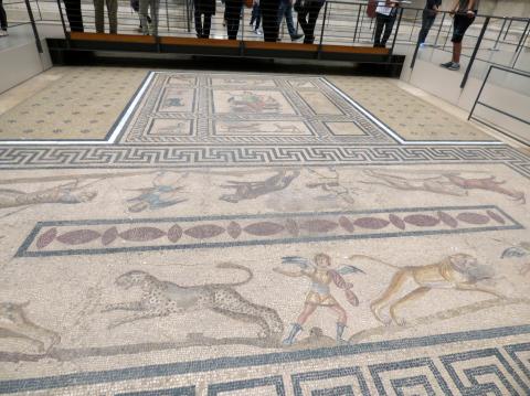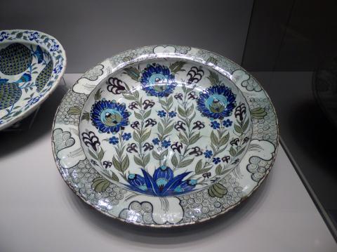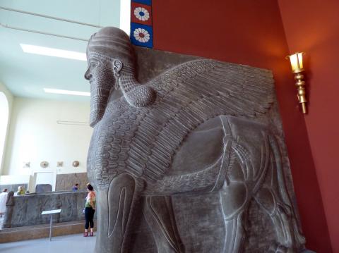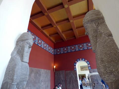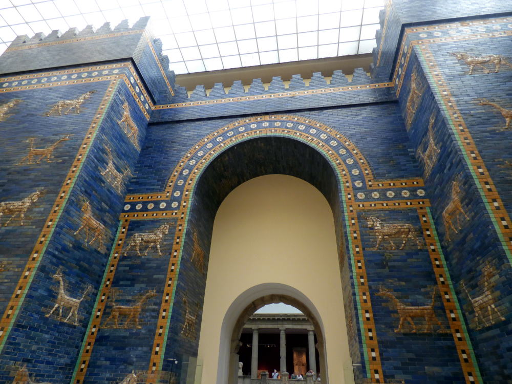 館内もう一つの目玉は「イシュタール門」。古代バビロニアで紀元前6世紀に建設されたもので、青い彩釉煉瓦の壁に想像上の動物が描かれている。イシュタールとは戦いの女神で、彼女を守っているのが聖なる動物ライオン。この門も見事だが、そこへ続く道がまた素晴らしい。門と同じ青彩釉煉瓦の壁に忠実そうなライオンが描かれている。