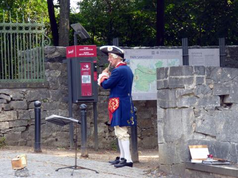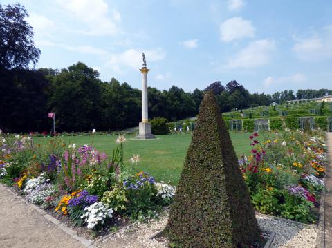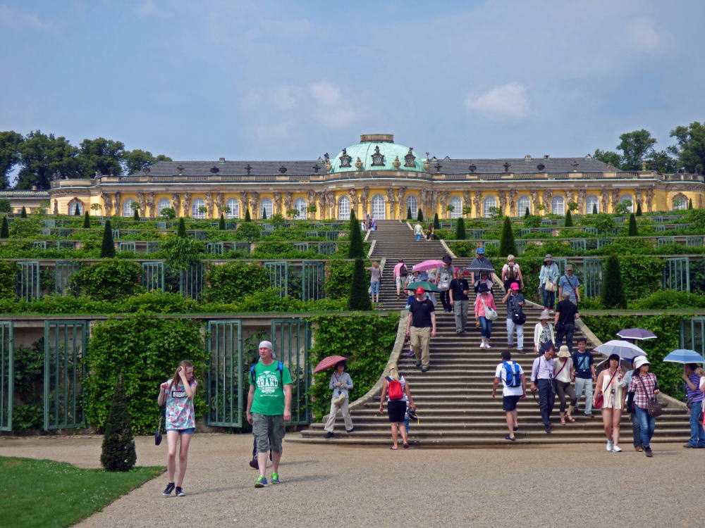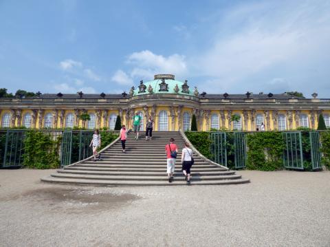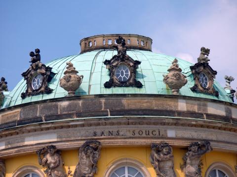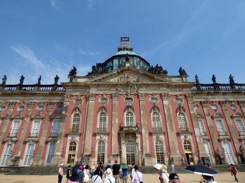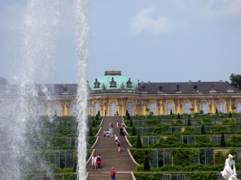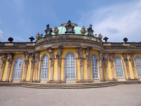 サンスーシ宮殿は、プロイセン国王のフリードリヒ2世が1745~47年に建てたロココ様式の宮殿です。当初は夏の離宮として建てられたものの結果的にはここが居城となりました。フリードリヒ2世の好みを反映した平屋建てのこじんまりとした建物ですが、音楽室だけは不釣合いなほど豪華に造られています。文化や芸術を愛したフリードリヒ2世はここで音楽会などを催しました。サンスーシとはフランス語で「憂いなし」の意味で、静養に訪れたフリードリヒ2世の心境が表現されているかのようです。