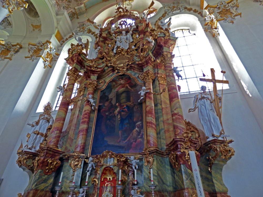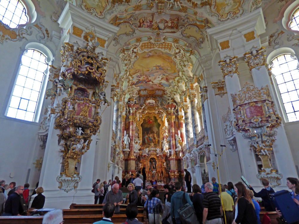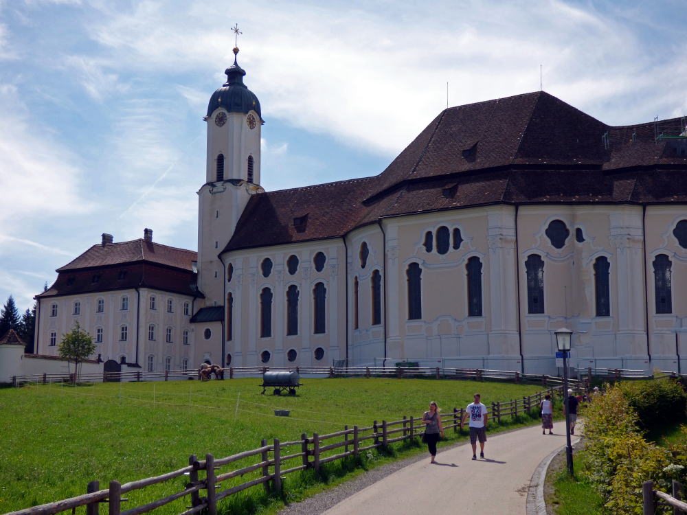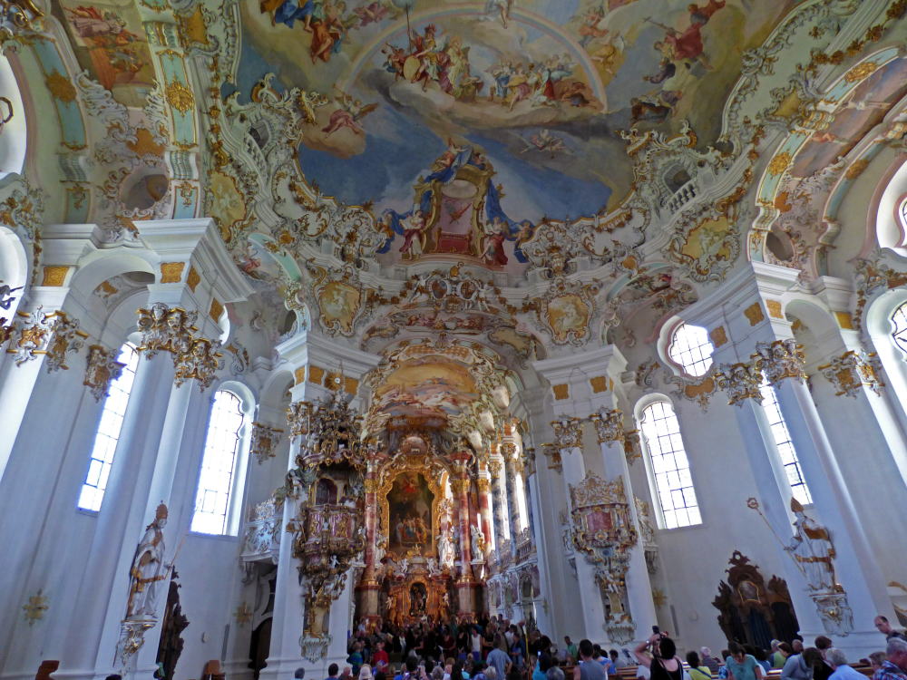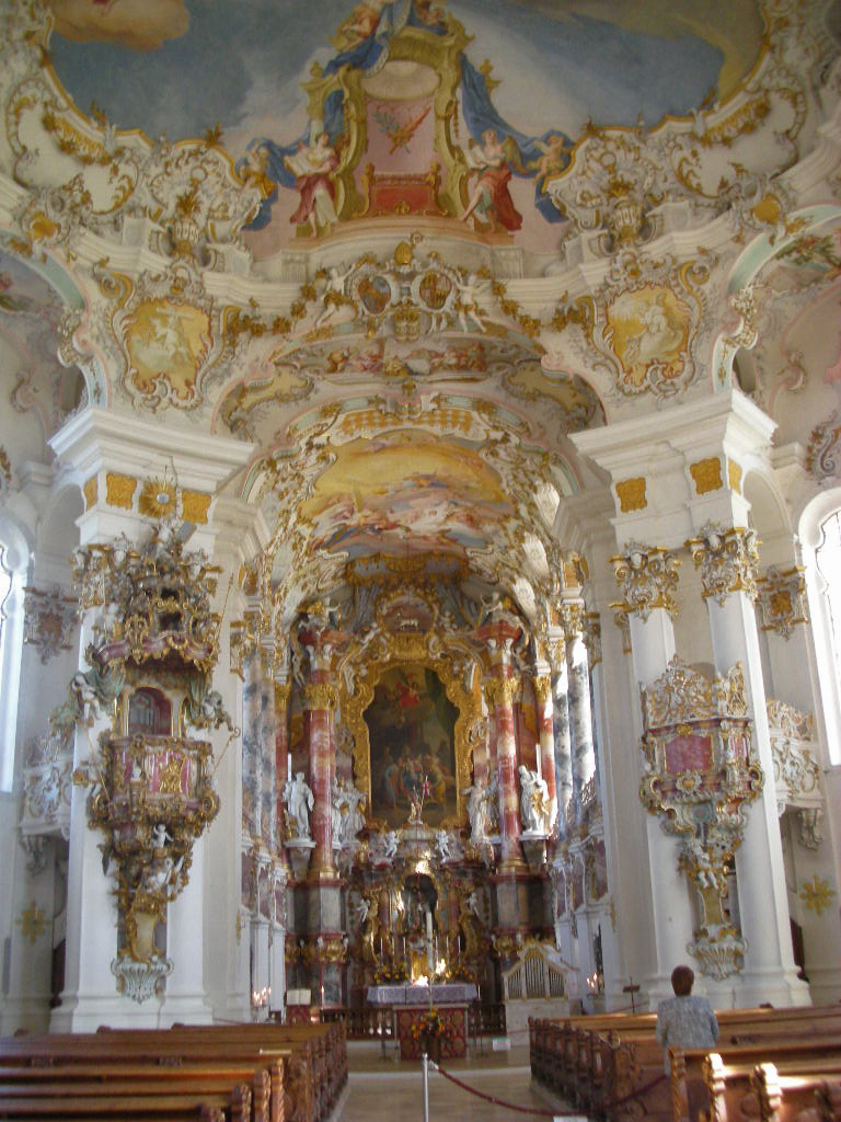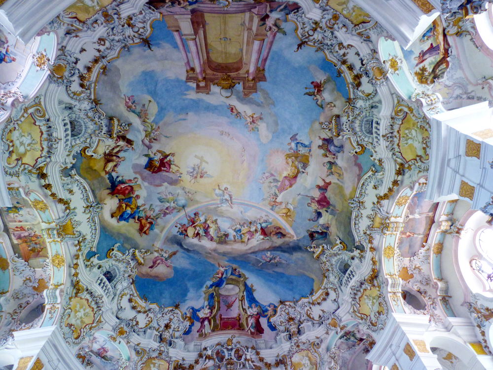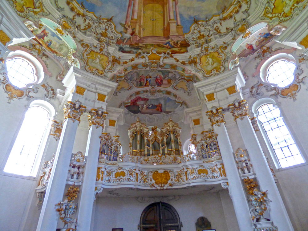 アルプスを背に立ち、緑の牧草地に白壁が映える教会は、当時の高名な建築家ドミニクス・ツィンマーマンの手によるもの。素朴な外観に比して、内部の装飾は華麗で繊細。その際立つコントラストに目を見張ります。ドイツ・ロココ様式の最高傑作と称えられ、主祭壇の天井フレスコ画は宮廷画家だった兄のヨハン・バプティストの作品。パイプオルガンも、じつに華やかに装飾されています。