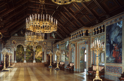 最も絢爛豪華な部屋としては、2つの広間が挙げられます。 「歌合戦の広間」は、ヴァルトブルク城の「歌合戦の広間」と「宴会の広間」という2つのモデルをひとつにまとめたもので、オリジナルのものより大きく豪華ですが、ここでは歌われことも祝われたこともありませんでした。