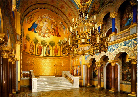 高さ15メートルのアーケードが設けられた、2階の「謁見の間」では、金と青による非常に豪華な内装で目がくらむほどです。 しかしながらルートヴィヒ2世は、当時の最新技術を駆使して、自身の中世への憧憬を「聖杯の間」に結集することに、とりわけ熱中していました。