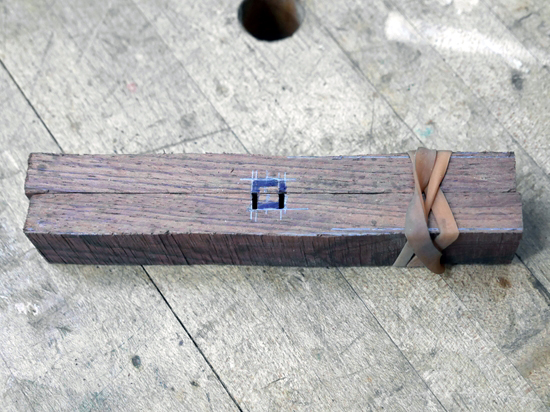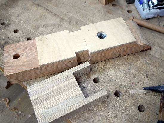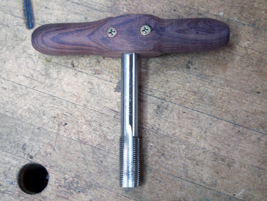 M14のタップを購入しましたが、ハンドルが無く回しにくい状態でした。ホームセンターに買いに行きましたが、販売されていませんでした。通販で買っても良いのですが、自作する方が安上がりなので作りました。2枚の板にバンドソーで溝を切って張り合わせるだけです。製作の動画は下の写真をクリックすると見ることが出来ます。 |