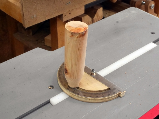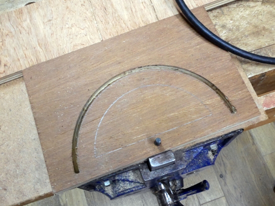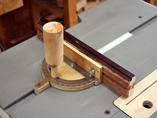 テーブルソー用にマイターゲージを製作しました。円弧の溝のカットはトリマを使っています。詳細な作り方は下の写真をクリックして動画を見てください。 |