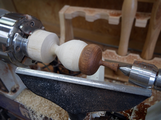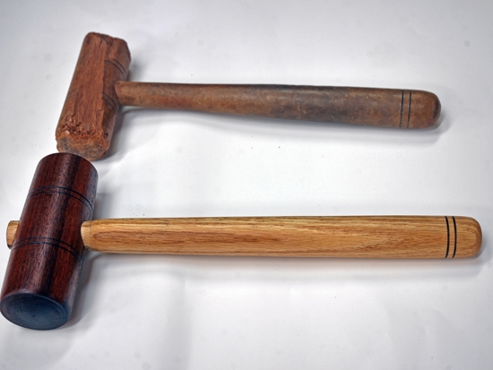 工房で使っている木製のハンマーは酷使がたたって一部が割れてしまっています。そこで新しいハンマーを旋盤で引きました。ヘッドはブビンガ、柄はレッドオークです。ターニングの動画は下の写真をクリックしてください。 |