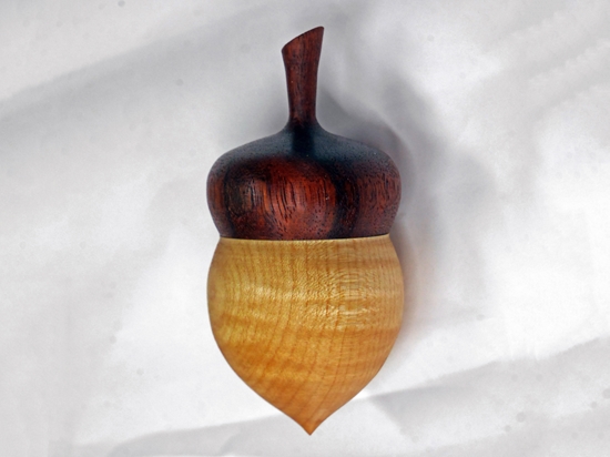 旅行の時に必要となる携帯型の薬入れをどんぐりの形で作ってみました。蓋は茶色のかりん材、身はヨーロッパ産のシカモア(カエデ科)です。手持ちの材料では高級な木です。5~6個作って知り合いにあげる予定です。動画は下の写真をクリックしてください。 |