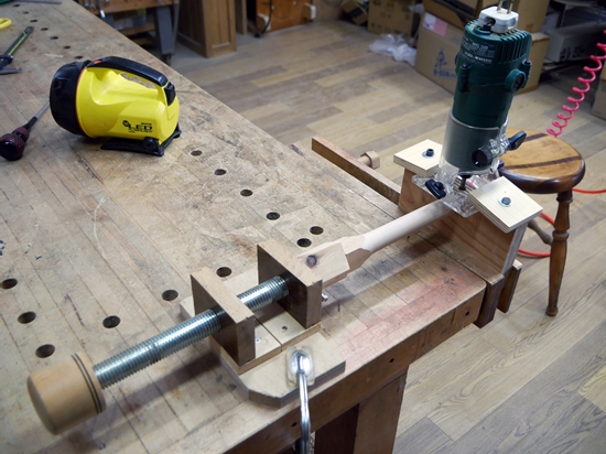 1"x8TPIのボルトが必要になり、以前に作ったことがあるねじ切りジグを使ってネジを切った。先端が60度のビットをトリマに取り付けてネジを切っていきます。動画は下の写真をクリックすると見れます。 |