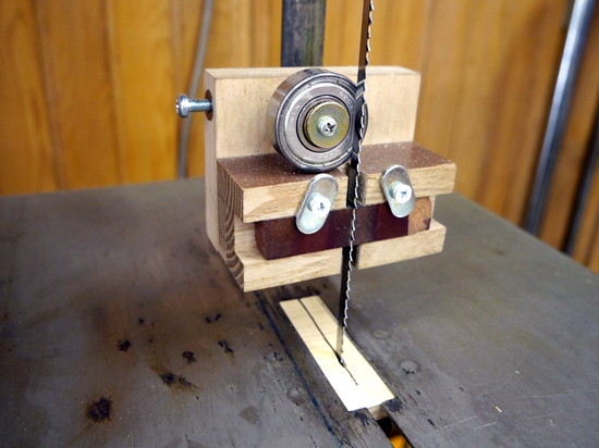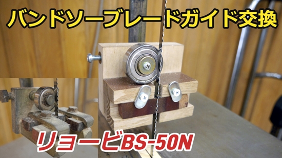 リョービのBS-50Nというバンドソーは、50mm幅のブレードを取付けて挽き割が出来ます。しかし19mm幅以上のブレードは取付けないので、既存のブレードガイドが合わない物になっています。そこで細いブレード用のブレードガイドを自作しました。ブレードがねじれにくくなり非常に使いやすくなりました。製作動画は下の写真をクリックしてください。 |