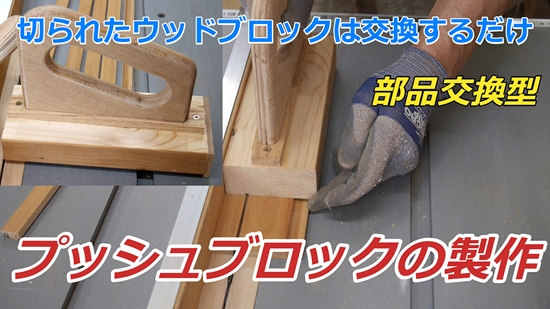 テーブルソーで使うプッシュブロックですが、今回は鋸刃の真上から押さえることが出来る自己犠牲型です。プッシュブロックも切られますが、底板は交換できるようになっています。下の写真をクリックすると動画を見ることが出来ます。 |