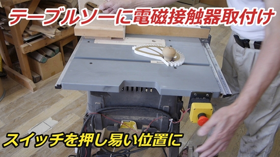 テーブルソーの電源スイッチはテーブルの下側に取付けられており、作業中に直接見ることが出来ません。テーブルの下を覗き込んでスイッチを切る必要があり、素早くできにくくなっています。そこでスイッチをテーブルの左横に取付けすぐにスイッチが切れるようにしました。モーターは100V15Aなので電磁接触器を使用しました。下の写真をクリックすると動画を見れます。 |