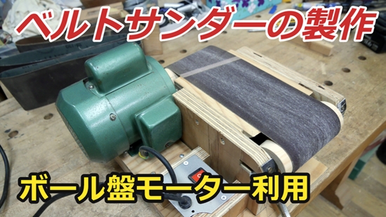 手持ちのベルトサンダー用のサンドベルトが数本あったので、固定型のベルトサンダーを自作することにしました。ベルトのサイズは100mmx610mmです。モーターは小形のボール盤から取り外した250Wの物です。ドライブ側のローラーはモーターのシャフトに直接取り付け、回転側のベアリングは手持ちの外形がそれぞれ28mmと32mmの左右外形違いを使いました。ありあわせの材料です。製作過程は下の写真をクリックすると見ることが出来ます。 |