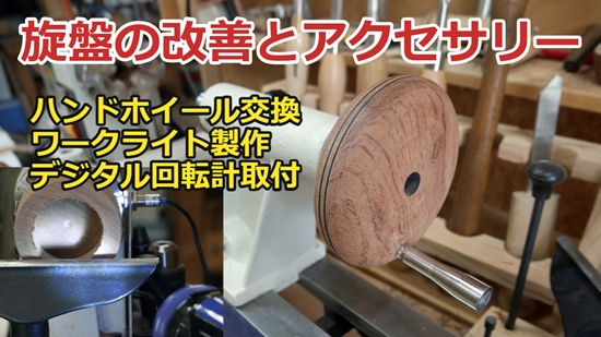 RIKON LITEのテイルストックのハンドホイールを木製の大きなものに交換しました。またワークライト、デジタル回転計なども取付けました。これで旋盤が使いやすくなりました。下の写真をクリックすると動画を見ることが出来ます。 |