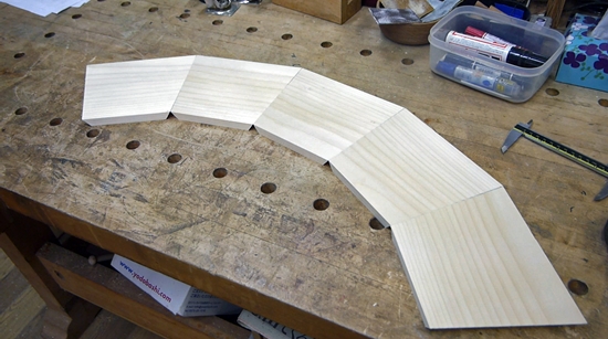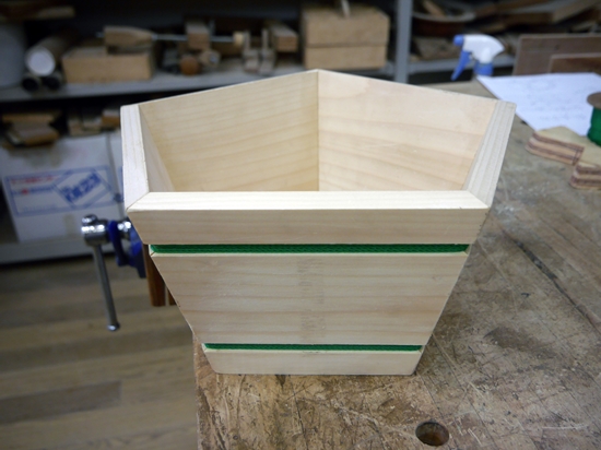 | 多角形で側面が傾いた箱は、切断角度を計算する方程式があり、その情報を使って5角形、15℃傾斜のプランターを作りました。この方程式を作った人は、非常に頭の良い人です。この表から留め切り角度は10.65度、鋸刃の傾きは34.59度なので、スライド丸鋸の切断角をこれらの値に設定して後は切るだけです。切った板を並べて接着剤を入れてガムテープで固定します。必要に応じてバンドクランプなどを使います。接着剤は普通の木工ボンドを使ったので、水が入った時にバラバラにならない様、ナイロンの紐を巻き付けました。製作過程の動画は下の写真をクリックしてください。 |