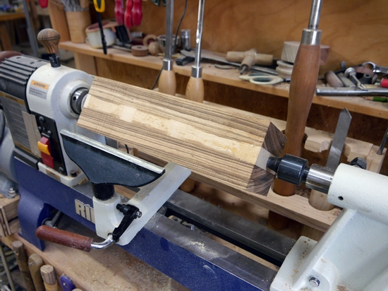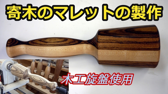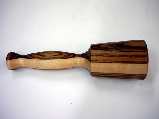 | 寄木のマレットを製作しました。寄木にしたのは太い角材が無かったので3枚の板を張り合わせて必要な太さの角材にしたわけです。寄木にしても旋盤で挽くのに問題はありません。完成後レモンオイルを塗りました。 |