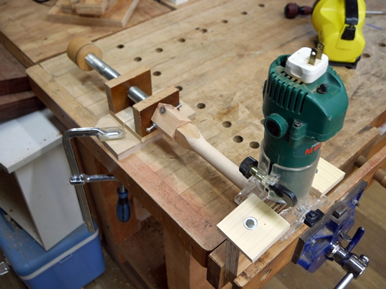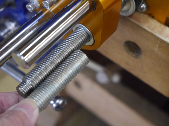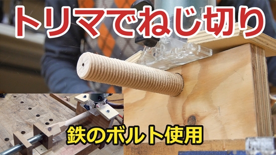 | 工房内に1"x8TPIのボルトがあったので、ベンチバイスの片効きを防ぐボルトを作ることにしました。鉄のボルトをそのままベンチバイスに使えば、目的は達成できますが、木で作ることに意味があるのでやってみました。先端が60度のトリマビットがあれば、ボルトの先端に取り付けた丸棒にネジを切ることが出来ます。製作の動画は下の写真をクリックすると見ることが出来ます。 |