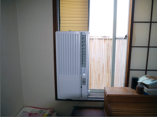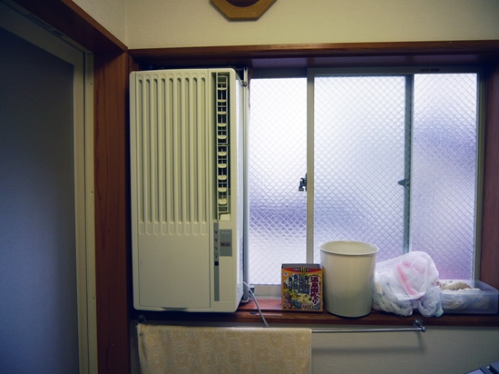 | 簡単に付属の窓枠に置くだけで取付けられるウインドウエアコンを台所横に取り付けていましたが、あまり使わないので洗面脱衣所に付け替えることにしました。簡単に取り外すことが出来、枠を脱衣所の方の窓に取り付けました。窓枠は木ねじが効くので非常に簡単でした。冷房のみで冬場は使わないので、後ろの窓は閉めておきます。使う時は窓を放熱器の部分だけあけることになります。 |