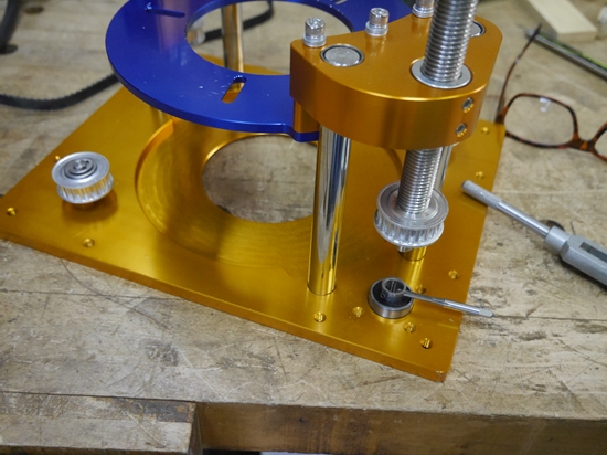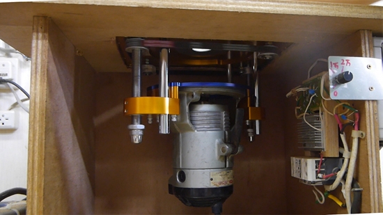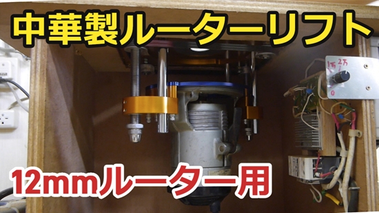 | 自作のルーターリフターを長年使ってきましたが、最近は上下の動きが渋くなり、手直しが必要と考えていましたが、AliExpressのサイトに廉価なリフターがあり購入することにしました。トリマ用は沢山ありますが、ルーター用は1機種しか売られていませんでしたが、安いので購入決定です。商品が到着したので、早速動かして見ましたが、上手く上下しません。構造は四隅にベルトをかけるプーリーが取り付けられていますが、このうちの一本のポールの押しねじが馬鹿になっており空回りしていました。押しねじを外すと、斜めにねじ込まれていたようで新しい物に交換、金具の方のメスネジはタップで切直してねじ止め出来るようにしました。これで昇降機構が動くようになり、ルーターテーブルに取り付けました。動画は下の写真をクリックしてください。 |