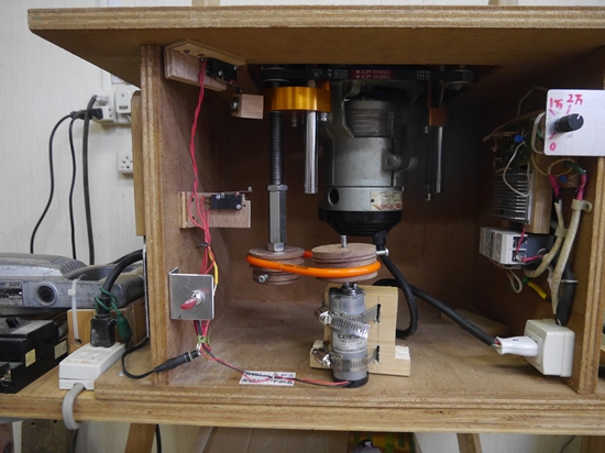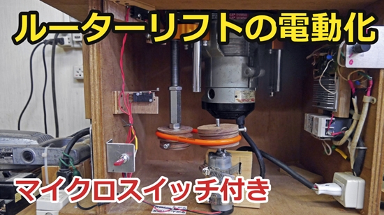 | 購入した中華のルーターリフターは、最初問題がありましたが、修理後は問題なく使えています。しかしビットを交換する時一番上までルーターを上げるには、沢山ハンドルを回す必要があります。そこでヤフオクで安いギアモーター(DC24V,200RPM)があったので購入して取り付けました。リフターの上下用のボルトはM16ですが先端がM12に変換されていました。このM12の部分に高ナットを取付けプーリーも取り付けることが出来ました。プーリーは旋盤で自作し、ベルトは熱溶着ベルトのスターロープです。ルーターが上限停止位置まで来た時に、電源を切るマイクロスイッチを取り付けました。製作動画は下の写真をクリックしてください。 |