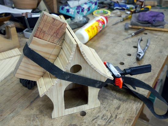 | 端材の板があったので巣箱を作ってみました。前後の壁はCADソフトで図面を描いてそれをバンドソーでカットしました。屋根の板はクランプが難しいので、木型を作って押し付けることが出来るようにしました。接着に失敗したところがあって、少し変形していますが、一応完成しました。 |