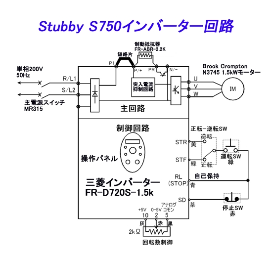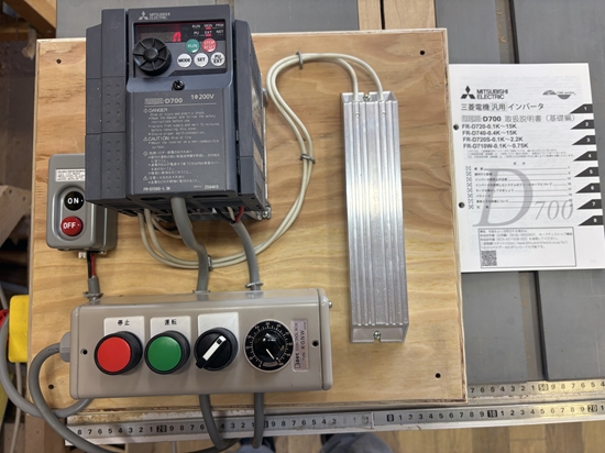 | スタビのS750のインバーターが壊れたので、新しい物を作って欲しいという依頼があった。モーターの銘板を見ると1.5kW(2馬力)のモーターだったので、2馬力用の三菱のインバーターを購入することにした。最近は食料品だけでなく、このような電子部品の値段も上がっており、以前に比べると修理費用がかさむようになってきました。合板の上にインバーター、制動抵抗器などを取付け配線完了、無事にお渡しすることが出来ました。 |