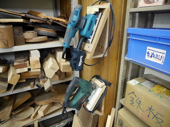 | グラインダー、電気のこぎり、ディスクサンダー、ジグソーの4つの手持ちの電動工具は、今まで棚に並べて置いていましたが、取り出しにくい。そこで壁にひっかっける棚を作り、取り出しやすいようにしました。材料の木は端材を使ったので出費はゼロで出来ました。 |
