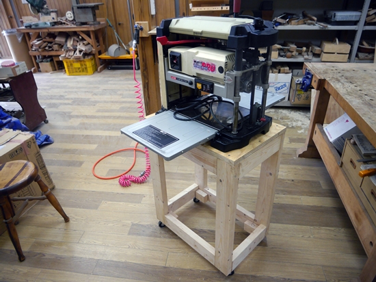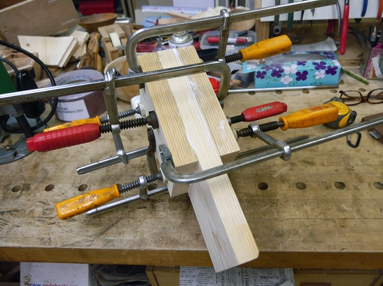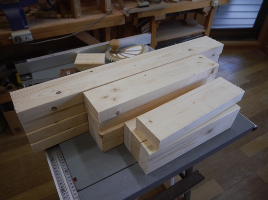 | 自動カンナ盤を購入したので、これを置く台を作ることにしました。材料は2x4材です。中華製のダボ穴治具を使って組み立てることにしました。2x4材は完全な平面が出ていないので、ダボ穴治具を使っても完全にぴったり組み立てることが出来ません。手押しカンナ、自動カンナを使って完全に平面を出すと隙間の無い完全な組み立てが出来ますが、今回はそれ程の精度がいらないのでカンナはかけずに組み立てました。少しずれが出ましたが問題ないレベルです。 |