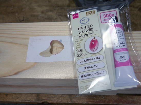 | マレットにハート形のインレイをやることにしました。木を入れるのではなく今回は、100円ショップで売っているUV-LEDレジン液(330円)を使いました。一般的に売られているエポキシレジンより粘度が高く空気が入りました。1回目は上手くゆかず、やり直して何とかできましたがインレイ用にはあまり向いていません。2液性のエポキシレジンを使った方がうまくゆきそうです。 |