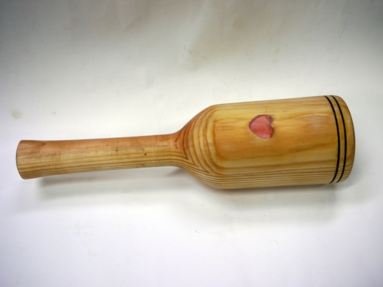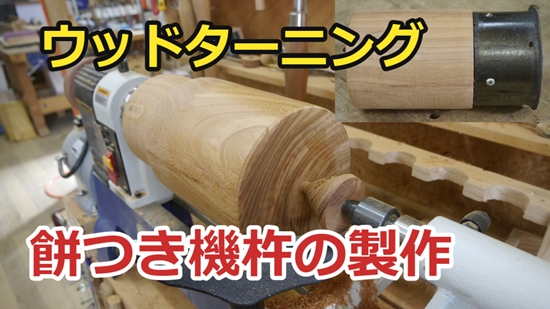 | 近所の和菓子屋さんの餅つき機が12年前に杵の部分が壊れたので、その時ウッドターニングで挽きました。しかし今回12年後になりますがまた杵の部分に割れが出てきたので新しい物を作って欲しいと依頼がありました。旋盤が小形になっていますが、直径が15cmぐらいなので引き受けました。やはり小型旋盤だと直径54mmの鉄棒の入る穴をあけるのに苦労しましたが、何とか完成させることが出来ました。予備としてもう一つ同じものを挽いて納めました。 |