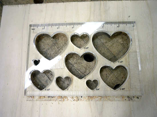 | ハート形のテンプレートを購入しましたが、厚みが6mmしかありません。手持ちのテンプレートガイドの高さは6.35mmあるので使うことが出来ません。そこでテンプレートを合板にコピーすることにしました。フラッシュビットを使ってルーターテーブルで切っていくだけです。細いビットがあったので一番小さいハートも切ることが出来ました。 |