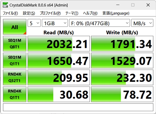 | USBメモリーがありますが、手持ちは64GBと容量が少ない物です。少し容量の大きい物を買おうとしましたが、USB接続のSSDがあることを思い出しました。値段を調べるとそれ程高くないので512GBの物を購入しました。2000MB/sと高速の物です。早速ベンチマークすると読み込みは2032MB/sで書込みは1791MB/sでした。十分早くメインのパソコンからノートPCに情報を移す時便利になりました。 |