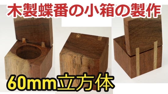 | 60mm角の小箱を作ってみました。蝶番には木の板とくぎを使っています。穴はフォスナービットであけるだけなので非常に簡単に出来上がりました。 |